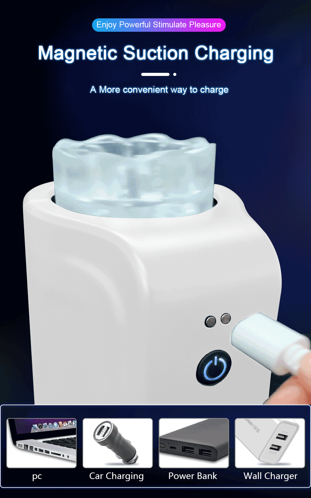 Ładowanie tego męskiego masturbatora jest niezwykle proste i wygodne, dzięki magnetycznemu kablowi USB. Wystarczy, że podłączysz go do ładowarki lub portu USB i poczekasz, aż bateria się naładuje.